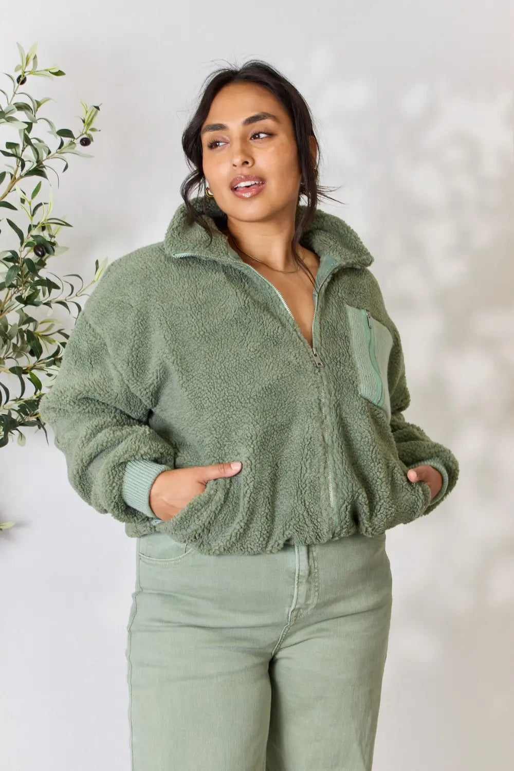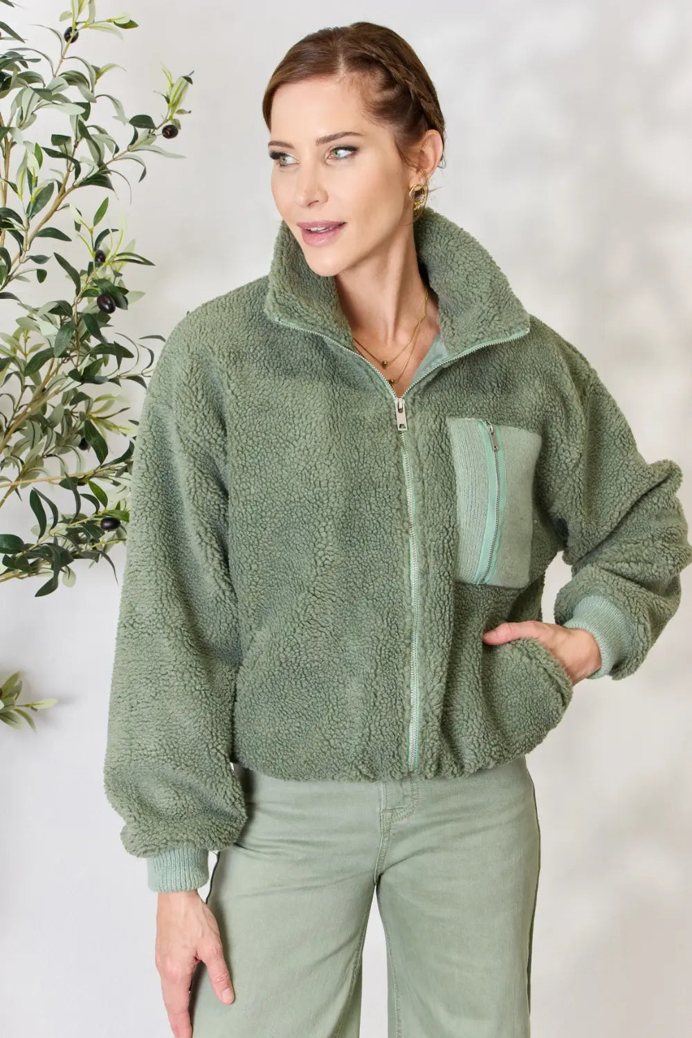 This cozy and chic jacket is a must-have for the colder months, featuring a soft and luxurious sherpa fabric that will keep you warm and stylish. The front zipper closure provides easy wear, while the collar adds an extra layer of warmth and sophistication.