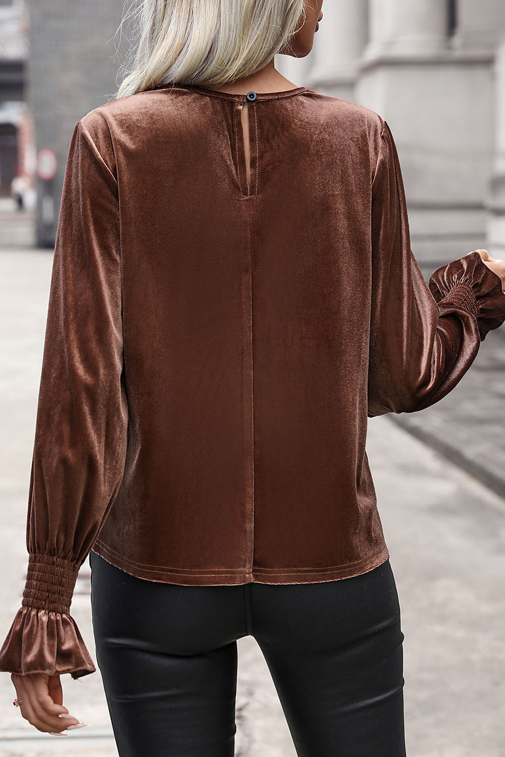 Lace Detail Round Neck Smocked Flounce Sleeve Blouse